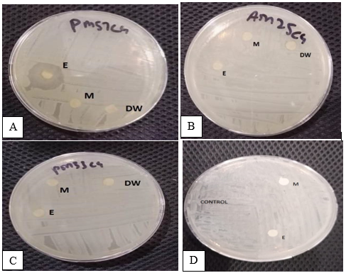 The ethanol extracts showed a maximum zone of inhibition against most of the isolated bacteria. Ethanol extracts showed zero zones of inhibition only in PM33C4 and AM25C4 in both disc and well-diffusion methods. The methanol extracts showed a maximum zone of inhibition only in PM56C4, AF34C4, and PM57C4 in both disc and well diffusion methods (Figures 6 and 7). Distilled water extracts showed no or zero zones of inhibition in all isolated bacteria in disc diffusion and well-diffusion methods as shown in Table 9.