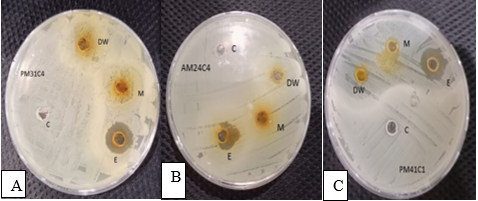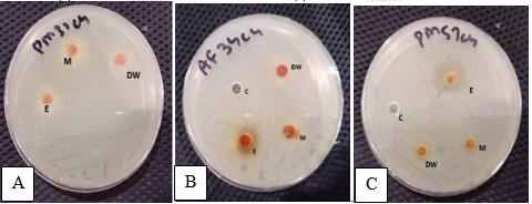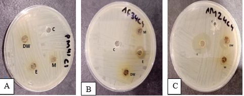 Figure 2. Effect of Neem by Well Diffusion Method (a) Effect of Neem Extracts on PM41C1 (b) Effect of Neem Extracts on AF34C4 (c) Effect of Neem Extracts on AM24C4.