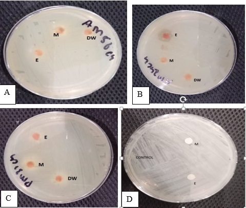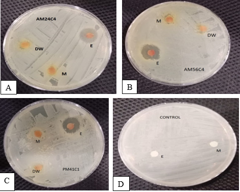 Figure 6. Combine Effect by Disc Diffusion Method (a) Effect on AM24C4 (b) Effect on AM56C4 (c) Effect of Extract on PM41C1 (d) Control