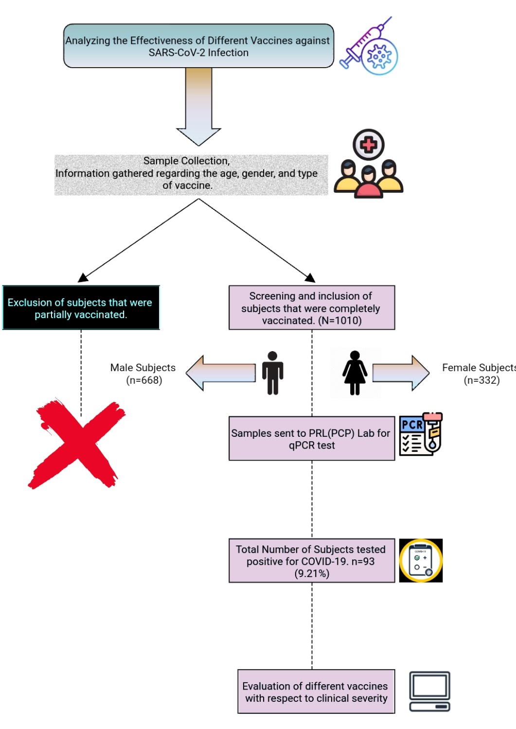 This cross-sectional study was conducted at the Institute of Public Health, Mayo Hospital, Lahore, Pakistan. People tested for SARS-CoV-2 in Mayo Hospital, Lahore from September 18, 2021to October 18, 2021 were screened for inclusion. Out of the 1010 enrolled subjects, 668 were male and 342 were female. The enrolled subjects were recruited from Lahore, Pakistan. Convenient sampling method was adhered to for their enrollment. Written informed consent was obtained from the patients during data collection. Only completely vaccinated subjects were included, while partially vaccinated subjects were excluded. Data including the types of vaccines, number of dozes, and the date of vaccination were recorded. Fig. 1 presents the study design in the flow chart diagram. Table 3 presents the number of subjects included under each vaccine group.
