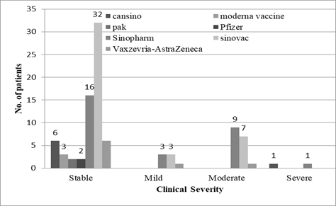 The clinical severity of infected patients was analyzed. It was found that most vaccinated people remained stable after being infected by SARS-CoV-2 (67 out of 93, 72.04%). Only two patients developed a severe condition. Moreover, the relationship of clinical severity with vaccination was not found to be statistically significant (p =0.63).