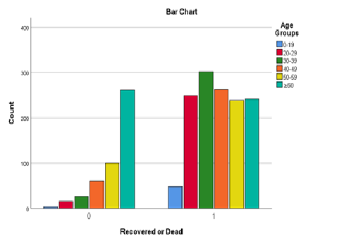 Figure 1. Number of the Dead (Represented by 0) and Recovered (Represented by 1) patients Corresponding to Different Age Groups