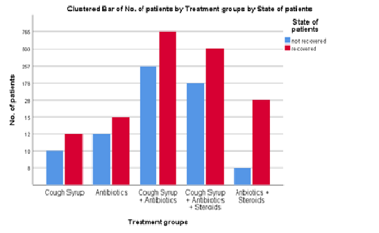 Statistically, the odds ratio quantifies the strength of the association between any two events. Chi-Square test was applied to the data, followed by risk estimation to evaluate the odds ratio. Treatment 1 consisted of the administration of cough syrup along with Panadol. Treatment 1 was given to 22 people, of which 12 recovered and 10 showed none or a very insignificant recovery rate. On the other hand, Treatment 1 was not given to 1,790 patients, of which 1331 recovered and 456 died. The odds ratio was calculated for treatment group one, corresponding to the state of recovery of patients (recovered or not recovered). After risk estimation, treatment group 1 was found to have a 41.4% chance of recovery as an untreated group. Treatment 2 involved the administration of cough syrup with Panadol and antibiotics to the patients. Treatment 2 was administered to 27 patients, of which 15 recovered and 12 did not recover or showed no response to the administered medicine. Meanwhile, 1,785 patients were not given Treatment 2, of which 1,328 recovered. The odds ratio was calculated for treatment group two, corresponding to the state of recovery of patients (recovered or not recovered). It was calculated that there were 43% odds of recovery against the corresponding untreated group. Treatment 3 included administering cough syrup with Panadol, antibiotics, and steroids to the patients. This treatment was administered to 1,022 patients, of which 765 recovered and 527 did not show any recovery. This treatment was not given to 790 patients, of which 578 recovered and 212 showed no recovery. The odds ratio was calculated for treatment group three, corresponding to the state of recovery of patients (recovered or not recovered). No significant odds of recovery were determined against the corresponding untreated group. Treatment 4 included cough syrup with Panadol and steroids, given to 681 patients in total, of which 503 patients recovered and 178 showed no recovery. This treatment was not given to 1131 patients, of which 840 recovered and 291 showed no recovery. Risk estimations to calculate the odds ratio showed no significant odds of recovery against the corresponding untreated group. Treatment 5 included antibiotics with steroids. This treatment was administered to 36 patients, of which 28 recovered and 8 showed no recovery. On the other hand, 1,776 patients were not given this treatment, of which 1,315 recovered and 461 showed no recovery. Risk estimation with 95% confidence interval was used to calculate the odds ratio for treatment group 5, corresponding to the state of recovery of patients. Significant odds of recovery were determined against the corresponding untreated group.