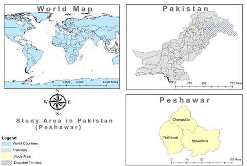 Figure 1. Study Area Showing Peshawar and Peripheries in Khyber Pakhtunkhwa (KPK), Pakistan.