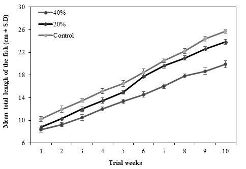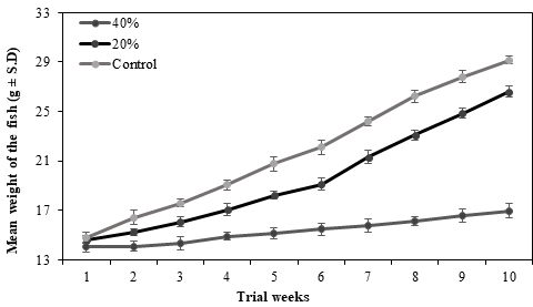 Fish fingerlings in all the aquariums actively consumed diet of all ratios (40%, 20%, and 0%). There was an increase in the growth of fish. The growth performance of fingerlings fed with diets (20% and 40%) during the whole study is given in the following graphs.