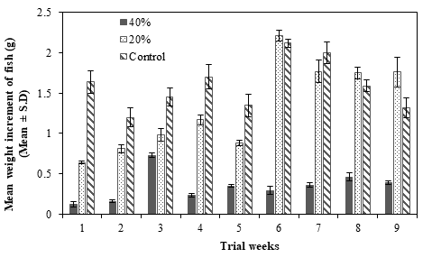 At the start of the experiment, the initial weight of fish was 14.03±7.44g in 40% maggoty diet group. The final average weight of fish after the experiment was 16.77±7.29g, with an average maximal increment of 0.39g during 10 weeks. The average initial weight of fish was 14.62±7.97g in 20% maggoty diet group. The final average weight of fish after the experiment was 26.61±8.63g, with an average maximal increment of 1.76g during 10 weeks. The average initial weight of fish was 14.78±7.45g in control group on maggoty diet. The final average weight of fish after the experiment was 29.14±8.34g, with an average maximal increment of 1.32g during 10 weeks (Figure 1 and 2).