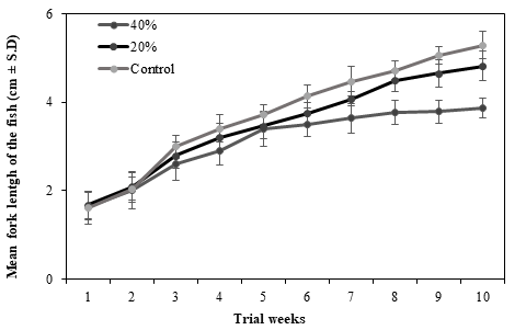 To estimate the growth performance of fingerlings, growth parameters (weight, total length, fork length) of all the groups (40% , 20%, control) were measured and observed on a weekly basis.