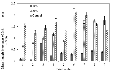 At the start of the experiment, the average length of fish was 8.38±1.27cm in 40% maggoty diet group. The final average length of fish after the experiment was 19.89±7.91cm, with an average maximal increment of 0.39cm during 10 weeks. At the start of the experiment, the average length of fish was 8.82±1.80cm in 20% maggoty diet group. The final average length of fish after the experiment was 23.83±7.55cm, with an average maximal increment of 1.76cm during 10 weeks. At the start of the experiment, the average length of fish was 10.23±5.91cm in control group. The final average length of fish after the experiment was 25.69±5.78cm, with an average maximal increment of 1.64 cm during 10 weeks (Figure 3 and 4).