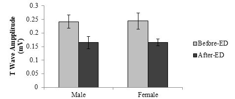 Figure 2: Amplitude of T wave before (before-ED) and after (After-ED) intake of ED in both genders. Error bars are showing standard error (n = 20, statistical significance; in males; p = 0.019, in females; p = 0.030)