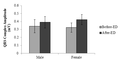3.3. Effects of ED on QRS Complex AmplitudeR wave of QRS complex showed an increase of 0.50 + 0.04 mV (14 %) in males and 0.10 + 0.01 mV (31 %) in females, as shown in Figure 3. However, this difference was not statistically significant (p = 0.876). The same pattern was observed in both male and female subjects and no gender difference was found.