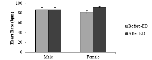 Figure 4: Heart rate before (before-ED) and after (After-ED) intake of ED in both genders. Error bars are showing standard error (n = 20, statistical significance; in males; p = 1.000, in females; p = 0.019)