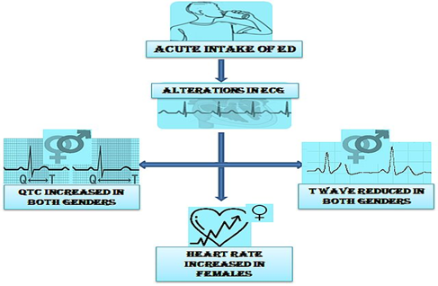 Methods. Twenty healthy participants with an average age of 22 years were enrolled in this study. Half of the participants were male and half were female. This study was conducted in the Department of Physiology, University of Karachi from July 2019 to October 2019. The participants were asked to drink 500 ml of ED. Later limb lead ECG was performed before (Before-ED) and 2 hours after (After-ED) intake. Recording and data analysis was done through Powerlab. Heart rate (HR) corrected QT interval (QTc), R wave, and T wave amplitudes and HR were calculated and analyzed.