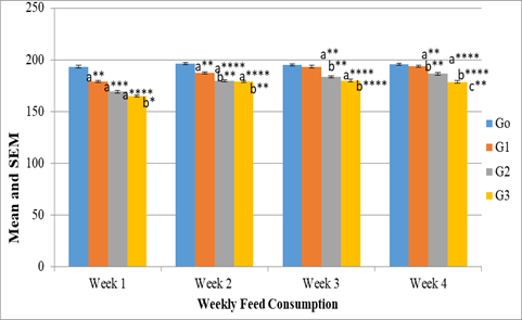 Figure1. Graphical Representation of Weekly Feed Consumption Between Control (Go) and Experimental Groups (G1, G2, G3).