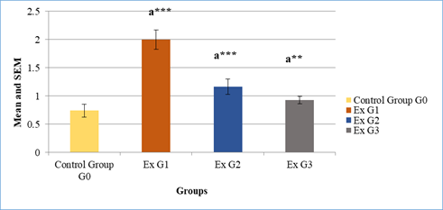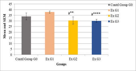 Figure 2 present the comparison of heart weight done between two respective groups when heart weights of control group (Go) compare with experimental groups (G1, G2, G3) no significant difference observed between them. When heart weight of G1 compared with G2 then p<0.01 was observed. When heart weight of G1 compared with G3 no significant difference was observed. When heart weight of G2 compared with G3, p<0.0001 was observed. Asterisks are representing the significant difference of heart weight among control group (Go) and experimental groups (G1, G2 & G3).