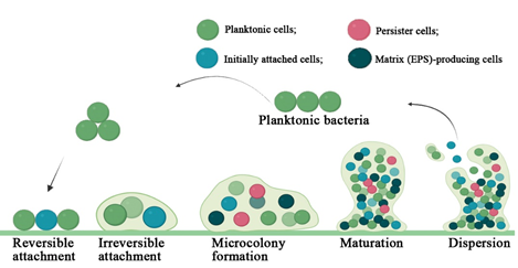 In this study, different stages of biofilm formation are depicted sequentially: free-floating planktonic cells undergo reversible attachment to a surface, followed by irreversible attachment, leading to microcolony formation. Over time, the biofilm matures into a complex structure embedded in an extracellular polymeric matrix, culminating in the dispersion of cells to colonize new surfaces.