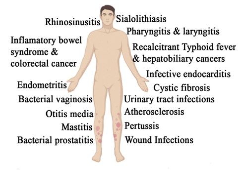 Calcified masses form in the salivary gland, which results in sialolithiasis. The infected individual may feel pain and swelling. Studies have reported the presence of microbial biofilms at this site [66]. Morphological analysis using confocal laser scanning microscopy also showed the presence of bacterial biofilms in acute sialolithiasis [67]. Salmonella enterica causes a foodborne disease known as typhoid fever. In patients with typhoid fever, S. typhi's biofilm has been reported in the gall bladder [68]. The colon epithelium is covered by a protective mucosal layer, which separates it from the luminal bacterial community. Sometimes, pathogenic microbes breach this layer, access the epithelium, and start biofilm development. This condition results in inflammatory bowel disease (IBD) [69, 70].