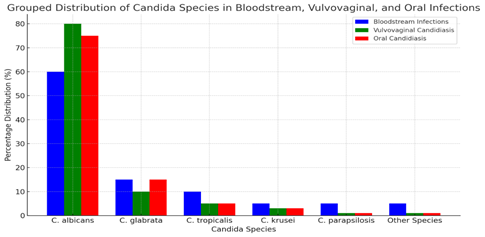 This chart illustrates the prevalence of various Candida species across different types of infections. C. albicans remains predominant in bloodstream infections, whereas non-albicans are more prevalent in vaginal and oral candidiasis [34].