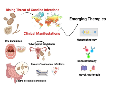 In conclusion, the rising global incidence of candidiasis, driven by increasing antifungal resistance, and emergence of resilient non-albicans species, highlights an urgent need for state of the art diagnostic and treatment strategies. Candida species particularly C. albicans remain a challenging pathogen owing to its dual nature as commensal and opportunistic invasive species, capable of evading host immune system by biofilm formation, phenotypic plasticity, and immunoregulation. The therapeutic landscape is further challenged by emerging resistance of non-albicans (C. glabrata, C. parapsilosis, and C. auris) to traditional antifungals, demanding a transformative shift in management approaches. Additionally, emerging therapies such as immunotherapy targeting macrophage function, quorum sensing inhibitors and nanotechnology based drug delivery significantly overcoming biofilm associated resistance. Moreover, engineered enzymes and probiotics underscore the potential of microbiome-based intervention to disturb C. albicans virulence. Therefore, further studies are required to address challenges particularly in immunocompromised patients where host-pathogen interaction are deregulated. .