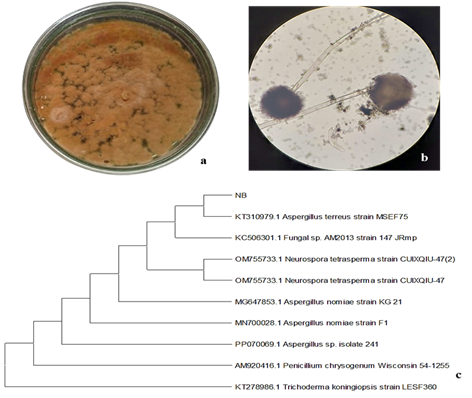 Figure 1. The Colony Morphologies of the Isolated Rhizospheric Fungi at the Macroscopic and Microscopic Scales. (c) The ITS rDNA Sequences of the Rhizospheric Fungal Strain A terreus Used to Build a Phylogenetic Tree