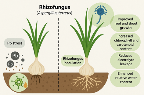 Background. Lead (Pb) contamination in agricultural soils is a growing concern, particularly in South and Southeast Asia, where root vegetables such as garlic and ginger are dietary staples. The primary sources of Pb in these regions include industrial discharge, mining activities, the excessive use of phosphate fertilizers, and atmospheric deposition. Pb disrupts plants’ physiological functions, that is, photosynthesis and nutrient uptake. It also enters the food chain, posing chronic health risks to human beings. Garlic (Allium sativum L.) is widely used for its culinary and medicinal value and remains especially susceptible to heavy metal accumulation in contaminated soils. This study investigates the potential of rhizospheric fungus (Aspergillus terreus) to mitigate Pb-induced stress in garlic, with a focus on enhancing agronomic traits and minimizing the health hazards associated with contaminated produce.