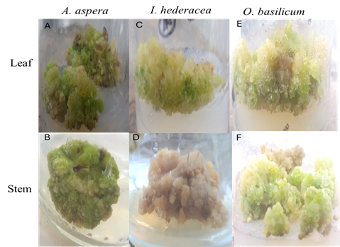 The leaf and stem explants of A. aspera, I. hederacea and O. basilicum were grown on MS media containing different combinations of plant growth regulators (PGRs). The effects of different concentrations of PGRs were recorded for the callogenic response of different explants of I. hederacea, that is, leaf, stem and root. The maximum callogenic response was exhibited by MS medium supplemented with 2.0 mg/l 2,4-D in combination with 4.0 mg/l NAA for the leaf of A. aspera as compared to other explants as the leaf callus had green colour and granular morphology (Figure 1A). The minimum callogenesis response was observed in MS medium supplemented with 0.5 mg/l 2,4-D, in combination with 0.5 mg/l BAP, for the stem of I. hederacea as compared to other explants. Stem callus was brown and had granular morphology. Stem explants of MSDB and MSDK of I. hederacea and O. basilicum respectively responded for callus induction with a low callus induction percentage (Table 2).