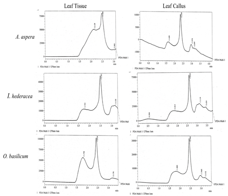 Figure 3. HPLC Profile of Seedling Leaf Tissue (Left Side) and Callus Culture (Right Side) of A. aspera, I. hederacea and O. basilicum. Leaf Extracts Exhibit Higher and Sharper Peaks, Especially Around ~2.6 Min, Indicating Greater Tannin Concentrations
