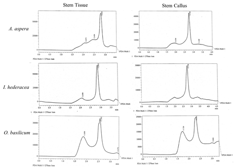 Figure 4. HPLC Profile of Seedling Stem Tissue (Left Side) and Callus Culture (Right Side) of A. aspera, I. hederacea and O. basilicum. Stem Extracts Show Moderate Peak Intensities