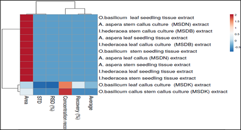 aspera leaf tissue extract exhibited the highest chromatographic area (1,245,086), highlighting a rich abundance of bioactive compounds and confirming its potential as a valuable phytochemical source. In contrast, O. basilicum leaf extract recorded the highest concentration recovered (22.9031 mg/mL), suggesting it is chemically potent and highly extractable. Remarkably, A. aspera stem seedling tissue demonstrated the highest recovery percentage (135.45%), while its callus culture produced the strongest average signal (101.25), both pointing toward enhanced metabolite accumulation, likely due to favorable in vitro culture conditions stimulating biosynthesis. On the other hand, I. hederacea stem seedling tissue showed the lowest area (41,976), indicating a low phytochemical yield from that specific tissue. The highest standard deviation (32.19) and relative standard deviation (RSD) (23.97%) were observed for I. hederacea leaf callus and stem seedling extracts, respectively. These value reflected low analytical precision and signaled the need for optimization to improve reproducibility (Table 4).