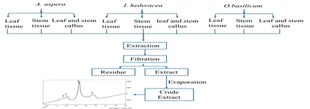 Background. Optimized HPLC profiling is a powerful and effective analytical tool to standardize plant samples and authenticate plant materials. In this study, three selected medicinal plants namely: Achyranthes aspera, Ipomoea hederacea, and Ocimum basilicum were subjected to callus induction following seedling, leaf, and stem germination.