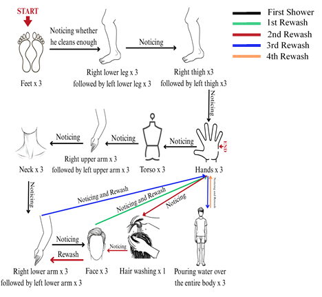 In April 2021, water splashed on the patient’s body from a broken washroom pipe, leading to an instant compulsive shower (consisting of multiple ghussal, as he still felt dirty after the first ghussal), lasting 90 minutes. Over time, he avoided the washroom entirely, except when absolutely necessary, which then triggered excessive hand and body washing rituals, leaving him physically drained. He also began to follow an elaborate, time-consuming bathing ritual that could take up to 3 hours (as shown in Figure 1), during which, if any step felt incomplete, he would restart the entire process.