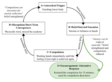 Case ConceptualizationThe case was conceptualized using the habit hypothesis of compulsion, discussing the sensory-driven urges to perform cleaning and washing rituals until achieving a sense of feeling "just right" (Miguel et al., 2000). His symptoms began during a period of academic stress, with handwashing escalating to ritualistic showers lasting up to 6 hours, driven by internal sensory tension rather than obsessive fears (Coles et al., 2003). The compulsions provided temporary relief but led to significant functional impairment, including disrupted daily routines and family conflicts (Summerfeldt, 2004).