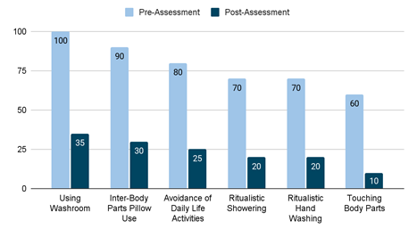 The current study focused on reducing the compulsions and improving the problem-solving capabilities of the patient presenting with Pure-C OCD. The patient was assessed through both formal and informal assessments. He was diagnosed with OCD with fair insight, which predicted his prognosis to be good. The key themes of compulsion were avoidance and excessive ritualistic handwashing and showering. ERP started with exposure to touching body parts, the original SUDs decreased from 60 to 10. The success was majorly attributed to family members acting as coaches, instead of enablers (Storch et al., 2007). This change forced the patient to face anxiety alone, which, when successful, strengthened the belief that compulsions are just learned behaviors that can be changed or reduced. This belief improved the prognosis of the later ERPs. However, it soon gave rise to excessive self-reassurance during the second ERP aimed at ritualistic handwashing. The post-handwash checking behavior was replaced by excessive self-reassurance. This aligns with existing literature, as self-reassurance is most found in OCD-related disorders and guards the prognosis (Kobori & Salkovskis, 2012). So, the ERPs focused on withholding self-reassurance along with compulsive behavior by introducing ‘gradual delay’ (Clark, 2019). Similarly, the rest of the ERPs were targeted, showing significant improvement (see Figures 3 & 4).