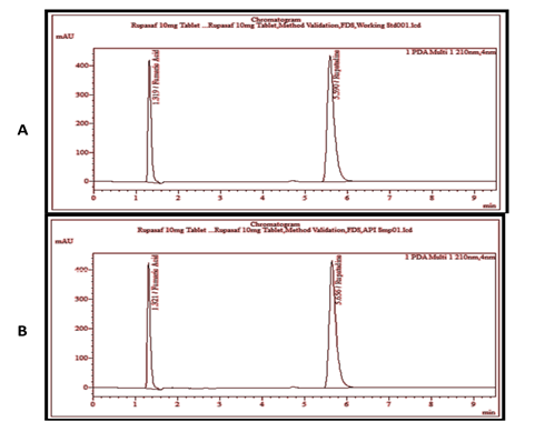 Figure 1. Chromatogram of Reference Solution (A) and RUP Sample Solution (Unstressed) (B)