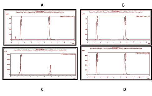 3.1. SpecificityThe peak purity of RUP was analyzed to obtain satisfactory results under stress conditions. Individual and combined chromatograms of diluent, mobile phase, placebo, RUP, and RUP with placebo were studied, as shown in Figure 1. It was observed that the placebo showed no interference in the retention time of the RUP peak. Few peaks appeared due to the solvent but the concerned peak of RUP showed good resolution. For the identification of fumaric acid and RUP, RUP system suitability CRS (containing impurities A and B) was also performed and the elution was compared with the elution order described in European Pharmacopoeia under “Related Substances Test,” that is, firstly fumaric acid and then RUP was eluted. So, from this comparison, it was confirmed that the peak at the retention time of 1.329 minute was of fumaric acid and at 5.763 minutes was of RUP.