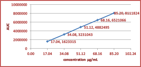 3.3.2. Limit of Detection (LOD) and Limit of Quantification (LOQ). LOD signifies the smallest quantity of drug that can be detected, while LOQ represents the smallest quantity of drug that can be quantified easily [25]. The LOD value was calculated as 0.63 µg/ml and the LOQ value was calculated as 1.91µg/ml.