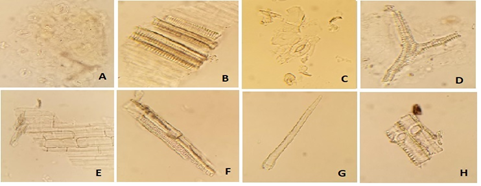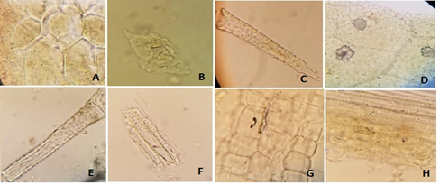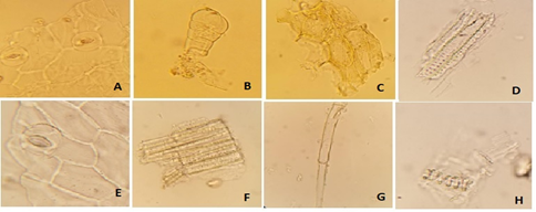 Figure 2. A (Epidermis containing stomata of leaf), B (Group of spiral vessels of leaf), C (Stomata of leaf) D (Vessels at vein termination), E (Parenchyma cells of stem), F (Fibers in stem), G (Unicellular trichome head of stem), H (Spiral vessel of stem)