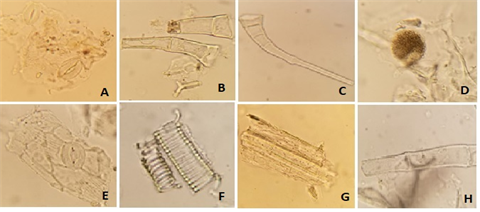 Figure 3. A (Glandular trichome of leaf), B (Glandular trichome head of leaf trichome), C (Parenchyma cells of leaf), D (Reticulate vessels of leaf), E (Epidermis cells containing open stomata in leaf), F (Fibers of stem), G (Fragment of a multicellular trichome), H (Spiral vessel of stem)