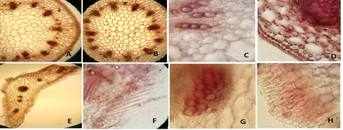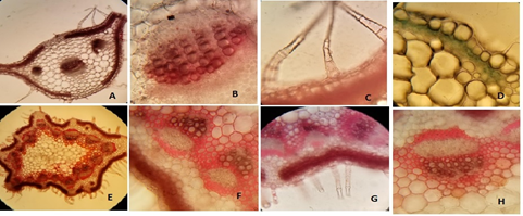 Figure 7. A (Transverse section of leaf showing all the anatomical structure of leaf), B (Epidermis cells with the stomata of leaf), C (Safranin-stained vascular bundles in leaf), D (Stomata in the upper epidermis layer of leaf), E (Transverse section of stem showing pith in the center), F (Phloem cells), G (Cortex of stem), H (Xylem cells)