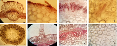Figure 8. A (Transverse section of leaf), B (Vascular bundles of leaf), C (Safranin-stained trichomes in leaf), D (Epidermis cells of leaf), E (Transverse section of stem showing pith in the center and all the anatomical structure of stem), F (Collenchyma cells below the epidermis), G (Epidermis containing covering trichomes), H (Vascular bundles surrounded by parenchyma cells)