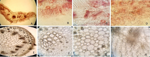 Figure 5. A, B (Transverse section of stem showing pith in the center), C (Safranin-stained vascular bundles surrounded by the parenchyma cells of stem), D (Epidermis cells of stem showing collenchyma cells below the epidermis of stem), E (Transverse section of leaf showing all the anatomical structure of leaf), F (Epidermis with covering trichomes), G (Safranin-stained vascular bundles surrounded by the parenchyma cells of leaf), H (Stomata in the upper epidermis layer)