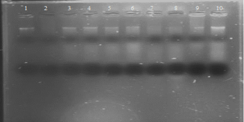 Well # 1 contains DNA and deionized water. An intact DNA band indicates that DNA is present. Well # 2 contains DNA, Fenton’s reagent, and deionized water. DNA smear indicates that DNA is damaged by Fenton’s reagent. Well # 3 contains DNA, Fenton’s reagent, and 50µg extract of C. bonariensis. DNA band indicates that the extract prevented DNA damage. Well # 4 contains DNA, Fenton’s reagent, and 100µg extract of C. bonariensis. DNA band indicates that the extract prevented DNA damage. Well # 5 contains DNA, Fenton’s reagent, and 50µg extract of A. conyzoides. DNA band indicates that the extract prevented DNA damage. Well # 6 contains DNA, Fenton’s reagent, and 100µg extract of A. conyzoides. DNA band indicates that the extract prevented DNA damage. Well # 7 contains DNA, Fenton’s reagent, and 50µg extract of E. alba. DNA smear indicates that the extract is less effective. Well # 8 contains DNA, Fenton’s reagent, and 100µg extract of E. alba. DNA smear indicates that the extract is more effective at this concentration. Well # 9 contains DNA, Fenton’s reagent, and 50µg extract of C. officinalis. DNA band indicates that the extract prevented DNA damage. Well # 10 contains DNA, Fenton’s reagent, and 100µg extract of C. officinalis. DNA band indicates that the extract prevented DNA damage.