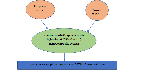 4.4. Graphene Oxide with Cerium OxideIn the current study, a cerium oxide/graphene oxide hybrid (CeO2/GO hybrid) nanocomposite system was created using the ultrasonic method. The MCF-7 cell line’s CeO2/GO hybrid revealed an increase in the apoptotic response as sample concentration increased. Hence, the CeO2/GO platform can be employed as a treatment platform for breast cancer. The generated CeO2/GO hybrid’s synergistic effects with the MCF-7 cell line are shown below in Figure 3 [20].