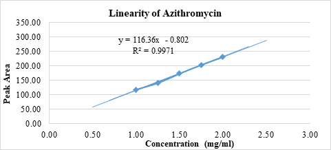 At 215 nm wavelength, the peak areas of the dilutions of AZM ranging from a concentration of 1mg/ml to 2mg/ml were measured using HPLC. The value of regression coefficient (R² = 0.9971) showed linearity (Figure 1). Further, LOD and LOQ values were found to be 0.81 µg/ml and 2.46 µg/ml, respectively.