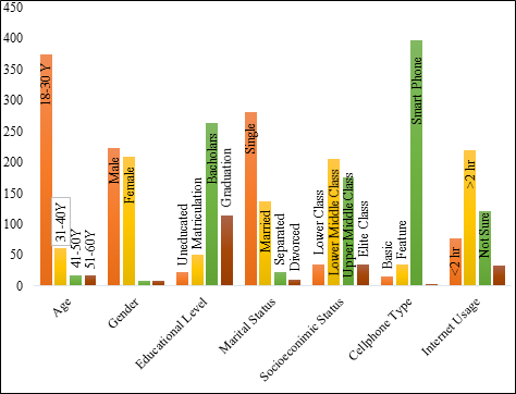 The current study was based on a sample size of 450 respondents. Among them 223 (50%) were male and 209 (46%) were female. The majority of the participants, that is, 374 (79%) fell in age group of 18-30 years, whereas the second major age group was 31-40 years with 61 (13%) participants. Graduation was completed by 114 (25%) participants, while 50 (11%) and 23 (5%) had either completed matriculation or were uneducated, respectively. The majority of the participants were single 280 (62%). A total of 205 (45%) participants reported themselves as lower middle class, 175 (39%) were recorded as upper middle class, while only 35 (8%) belonged to the elite class. The majority of the participants 396 (88%) used smartphones to access online pharmacy, followed by 34 (7%) and 16 (4%) through feature phones and basic phones, respectively. A total of 219 (49%) internet users used internet for more than two hours, while 77 (17%) of the participants used the internet for less than two hours. Table 1 summarizes the details of baseline characteristics of the studied sample.