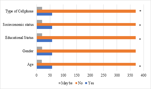 3.3 Demographic Differences in the Use of E-PharmacyThe analysis to check the differences in the use of e-pharmacy in participants based on their demographics was conducted. The analysis revealed counts (expected count) for age in 18-30 years, 31-40 years, 41-50 years, and 51-60 years as 56 (45.6), 2 (7.9), 0 (2.2), 0 (2.3) for Yes, 281 (291.9), 57 (50.3), 17 (14.0), 16 (14.8) for No, and 17 (16.5), 2 (2.8), 0 (0.8), 2 (0.8) for May be. The differences in usage were analyzed using Pearson chi square test. The results presented a very weak positive difference between the use of e-pharmacy services and age with the p-value of 0.014, χ2 of 15.926, and ϕ of 0.18. Counts (expected count) for gender, male, female, trans-male, and trans-female were 30(28.7), 28(26.9), 0(1.2), 0(1.2) for Yes, 184(183.9), 169(172.3), 9(7.4), 9(7.4) for No, and 9(10.4), 12(9.8), 0(4), 0(4) for May be. In the same manner, a very weak positive difference between the use of e-pharmacy and gender was exhibited with the p-value of 0.583, χ2 of 4.701, and ϕ of 0.10. Expected counts for the educational status for uneducated, matriculation, bachelors, and graduation or above were noted to be 0(3.0), 0(6.4), 15(33.9), 43(14.7) for Yes, 23(19.0), 47(41.2), 239(216.8), 62(94.0) for No, 0(1.1), 3(2.3), 9(12.3), and 9(5.3) for May be. A strong positive difference was found related to educational status with the p-value of <0.001, χ2 of 93.982, and ϕ of 0.45. The results showed counts (expected count) for socioeconomic status for lower class, lower-middle class, upper-middle class, and elite class as 0(4.5), 0(26.4), 40(22.6), and 18(4.5) as Yes, 35(28.9), 198(169.0), 128(144.3), and 10(28.9) as No, 0(1.6), 7(9.6), 7(8.2), and 7(1.6) as May be. In the same way, a strong positive difference with socioeconomic status was seen with the p-value of <0.001, χ2 of 125.319, and ϕ of 0.52. Whereas, the expected count for the type of cell phone for basic phone, feature phone, smart phone, or none were noted as 0(2.1), 2(4.4), 56(51.0), and 0(0.5) as Yes, 16(13.2), 32(28.0), 321(326.5), and 2(3.3) as No, 0(0.7), 0(1.6), 19(18.5), and 2(0.2) as May be. These values revealed a weak positive difference between the use of e-pharmacy and the type of cellphone presented with the p-value of <0.001, χ2 of 26.081, and ϕ of 0.24. Table 3 provides detailed count analysis and differences in the use of e-pharmacy services in participants based on their demographics.