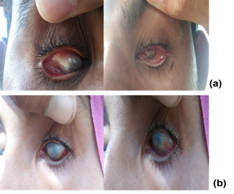 Figure 1. The Patients of (a) Anophthalmia Lacking Ocular Socket and (b) Microphthalmia with Smaller Eye Sockets.