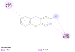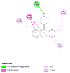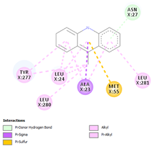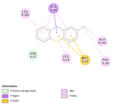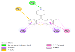 Comp-1 ligand was designed to dock at the binding pocket of the MDR protein of Stp. Comp-1 had the binding affinity of -6.7 kcal/mol. The residues observed by Met55 during the interaction were Ala23, Asn27, Leu24, and Leu281. The strong binding affinity of Comp-2 was measured at 7.0 kcal/mol but the interacting residues were Ala23, Leu 24, Asn27, Ala 141, Phe 20, Met 55, and Leu 281. The binding affinity of Comp-3 was 7.5 and the binding factors were Asn27, Tyr 277, Leu24, Ala23, Leu280, Met55, and Leu281. Comp-4 was found to be docked with the binding affinity of -6.6 kcal/mol. The binding affinity of Comp-5 was -6.9 kcal/mol and Comp-5 interacted with the residues Ala23, Asn27, Leu24, Met55, Phe20, and Leu281. Comp-6 bound to the MDR protein of Stp at A366, L369, A396, and P273 with a high binding affinity of -9.6 kcal/mol. Comp-7 and Comp-8 showed the binding affinity of 8.6kcal/mol. The residues that interacted with Comp-7 included Ala141, Phe 273, Arg 396, Leu369, and Ala 366. The associated residues involved in the interaction of Comp-8 were Ala366, Phe273, and Arg396, as well as Ala141. The weakest binding specificity attached to Comp-9 was -3.8 kcal/mol and the one-residue interaction site was Asn27. Comp-10 had a binding specificity of -7.4 kcal/mol and the interaction resolution sites released Leu24, Leu281, and Tyr277. Comp-11 and Comp-12 exhibited identical binding affinities. They had an affinity against each other of -7.3kcal/mol. Phe404, Leu 281, Ser 400, Tyr 277, Met 55, Ala 23, Leu 24, and Arg 396 were the residues involved in the interaction of Comp-11. Comp-12 interaction residues were Leu44, Leu282, Leu407, and Leu281 (Table 4).