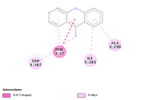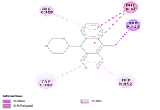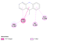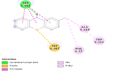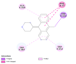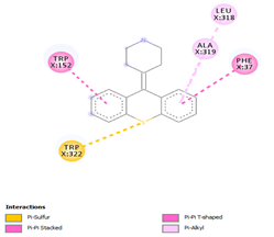Comp-1 docked at the binding pocket of MYCTO probable multidrug-efflux transporter MT1670 with Phe37, Ile383, Ala290, and Trp387. The binding affinity of Comp-1 was -7.2 kcal/mol. Comp-2 docked with the binding affinity of -7.4 kcal/mol. The residues involved in the interaction were Phe37, Ala290, Ile383, Leu318, and Trp387. The binding affinity of Comp-3 was -8.1 kcal/mol. Whereas, Phe37, Trp387, Ile383, and Ala290 were the residues involved in the interaction. Further, Ile383, Ala290, Phe37, and Trp387 were the residues involved in the interaction for Comp-4 and the binding affinity was -7.2 kcal/mol. Com-5 was docked with the binding affinity of -7.6 kcal/mol and the residues involved in the interaction were Trp152, Ala319, Trp322, Phe37, and Trp387. Comp-6 showed the maximum binding affinity with this protein which was -10.8 kcal/mol. The residues involved in the interaction were Ala319, Phe37, Trp322, Trp152, and Trp387. Comp-7 and Comp-8 had the same binding affinities. Their binding affinity was -10.0 kcal/mol. The residues involved in the interaction for Comp-7 were Leu318, Ala319, Phe37, Trp152, and Trp322. While, the residues found in the interaction for Comp-8 were Ala290, Asp293, Ala319, Leu318, Phe37, Thr156, Trp322, and Trp152. Comp-9 showed the binding affinity of -3.9 kcal/mol and the residues involved in the interaction were Leu124 and Trp87. The residues involved in the interaction for Comp-10, Comp-11, and Comp-12 were Trp152, Ala125, Leu124, and Val29, respectively. Comp-10 and Comp-12 had the binding affinities of -8.1 kcal/mol and -8.4 kcal/mol, respectively (Table 5).