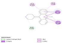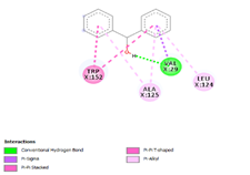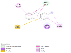 Comp-1 was docked with Ala268, Tyr239, Gln329, Leu150, and Phe154 at the binding pocket of the likely multidrug-efflux transporter Rv1258c. The binding affinity of Comp-1 was -6.7 kcal/mol. Comp-2 docked with Ala268, Tyr325, Phe154, Leu150, and Leu240. The binding affinities of Comp-2 and Comp-3 were -6.8 kcal/mol and -7.4 kcal/mol, respectively. The residues involved in the interaction were Leu240, Ala48, Met52, Phe154, Asp23, and Ile27. Comp-4 and Comp-5 showed binding affinities of -6.8 and -6.9 kcal/mol, respectively. The residues involved in these interactions were Ala268, Leu150, Phe154, Leu240, and Tyr325. Comp-6 showed the binding affinity of -8.7 kcal/mol. The residues involved in the interaction were Ala153, Ala20, Leu240, Leu150, and Asn151. The binding affinity of Comp-7 was -8.9 kcal/mol. The residues involved in the interaction were Ala20, Met52, Leu240, Leu150, Tyr239, and Phe154. The residues involved in the interaction for Comp-8 were Ala20, Met52, Leu240, Leu150, and Phe154. The binding affinity of Comp-8 was -8.4 kcal/mol. Comp-9 only interacted with a single residue of Tyr239 and the binding affinity was -3.7 kcal/mol. The binding affinity of Comp-10 was -7.4 kcal/mol. The residues involved in the interaction were Ala268, Phe154, Leu240, Tyr325, Tyr239, and Leu150. The binding affinities for Comp-11 and Comp-12 were -7.6 and 7.7 kcal/mol, respectively. The residues involved in these interactions were Ala268, Phe154, Tyr239, Leu150, and Leu240, respectively (Table 6).