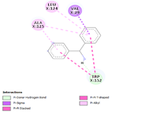 Comp-1 and Comp-3 were docked with Ala290, Ile383, Phe37, and Trp387 in the binding pocket of Rv1634, a potential multidrug-efflux transporter. Comp-1 and Comp-3 showed binding affinities of -7.2 kcal/mol and -8.2 kcal/mol, respectively. In the same way, the binding affinity of Comp-2 was -7.4 kcal/mol. The residues involved in the interaction were Leu318, Ala290, Ile383, Phe37, and Trp387. Comp-4 docked with Rv1634 at Thr156, Trp152, and Trp387, with a binding affinity of -7.2 kcal/mol. Comp-5 and Comp-6 were observed to dock with the binding affinity of -7.6 and -10.8 kcal/mol, respectively. The residues involved in these interactions were Trp152, Ala319, Trp322, Phe37, and Trp387. The binding affinity of Comp-7 was -10.0 kcal/mol. The residues involved in the interaction were Leu318, Ala319, Phe37, Thr156, Trp322, and Trp152. The residues involved in the interaction for Comp-8 were Ala290, Asp293, Leu318, Ala319, Phe37, Thr156, Trp322, Trp387, and Trp152. Comp-8 showed a binding affinity of -10.0 kcal/mol, while for Comp-9 it was -4.1 kcal/mol. Leu124, Tyr87, and Leu25 were the main residues involved in this interaction. Comp-10, Comp-11, and Comp-12 docked with Rv1634 at Trp152, Val29, Leu124 and Ala125, with a binding affinity of -8.2, -8.1, and 8.4 kcal/mol, respectively (Table 7).